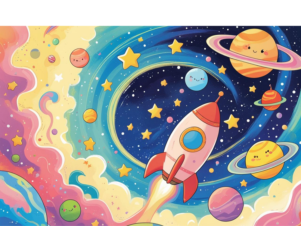 Saturno – Un viaje al espacio con planetas, cohetes y estrellas.